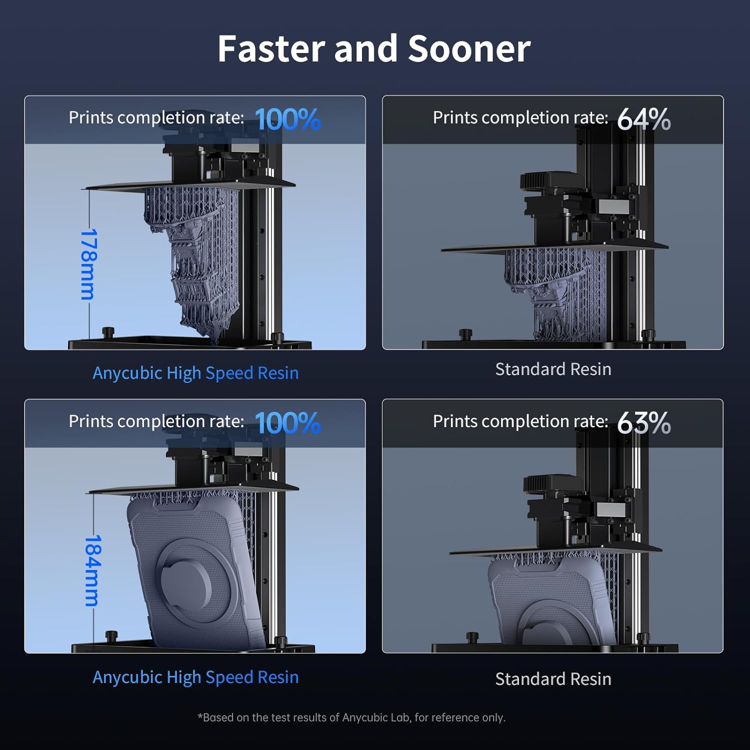 Más rápido: resina de alta velocidad utilizando material específico para resolver el problema del largo tiempo de impresión para el usuario. La resina de alta velocidad ANYCUBIC es especialmente adecuada para modelos de impresión grandes, con mayor velocidad y menor tiempo de impresión.