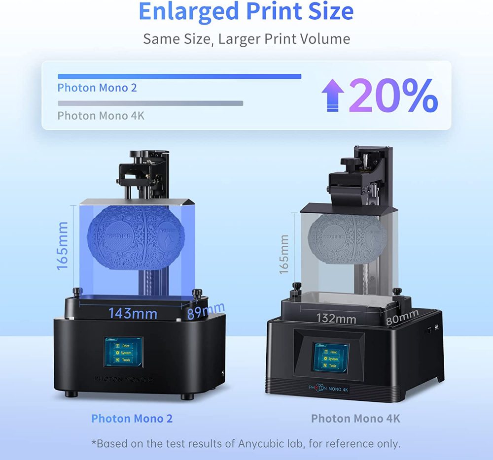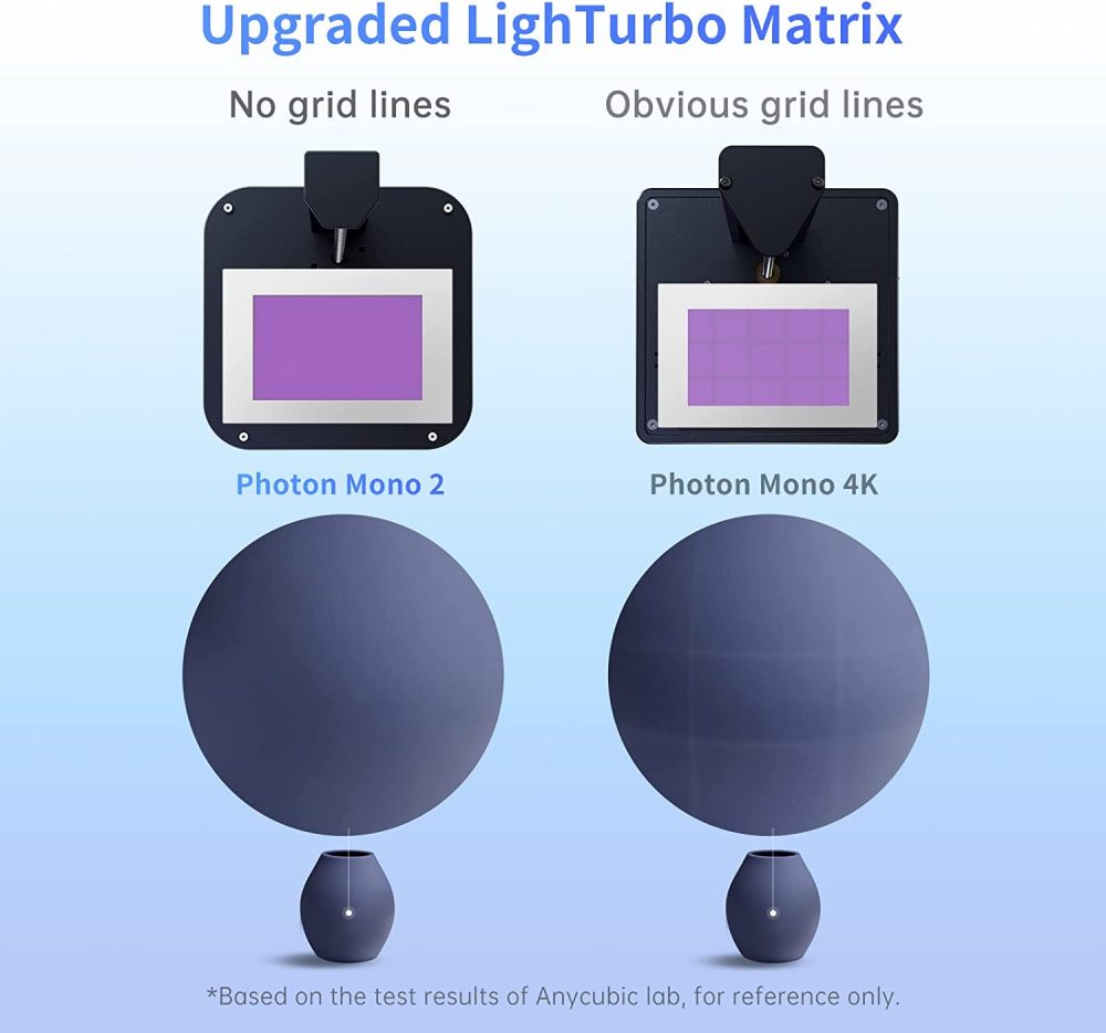 • Anycubic Photon Mono 2 tiene una vida útil de más de 20,000 horas, 10 veces más que las 2,000 horas de las pantallas LCD monocromáticas.