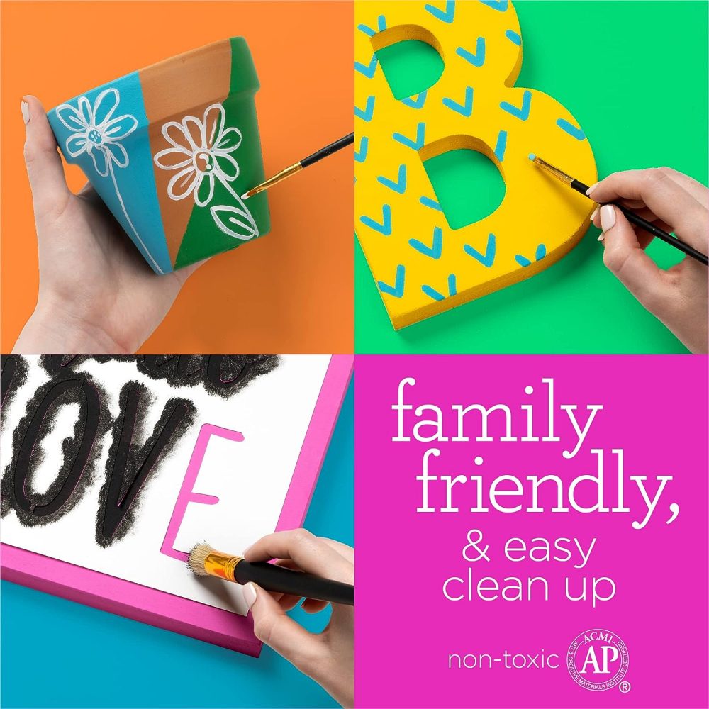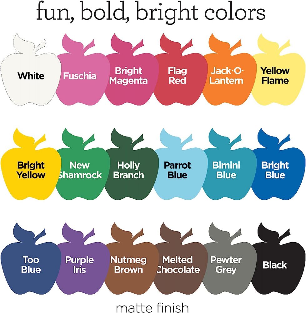 TAMAÑO CONVENIENTE Y COLORES BRILLANTES DIVERTIDOS: este versátil juego de pintura acrílica incluye 18 botellas de 2 oz de pintura artesanal colorida. Los colores de este kit incluyen: blanco, llama amarilla, amarillo brillante, magenta brillante, fucsia, Jack-o-lantern, rojo bandera, iris púrpura, azul loro, azul bimini, azul brillante, demasiado azul, trébol nuevo, rama de acebo, Marrón nuez moscada, chocolate derretido, gris peltre y negro