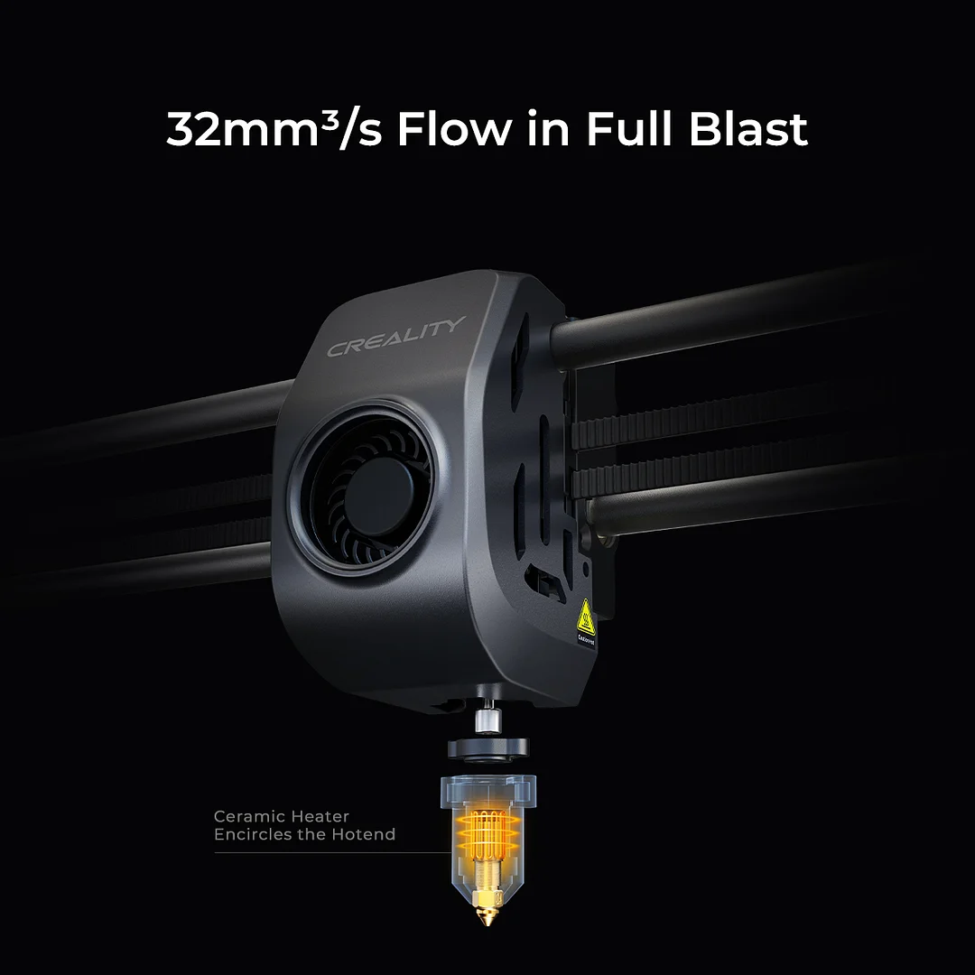 - Hotend de flujo máximo de 32 mm³/s: Garantiza una extrusión fluida y uniforme, incluso con materiales de alta viscosidad.