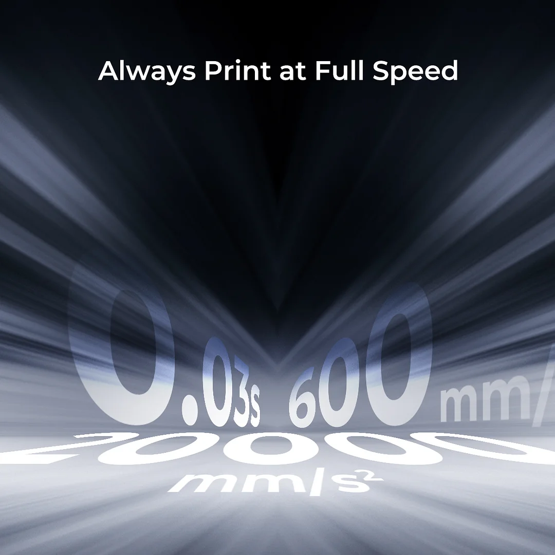 - Aceleración de 20.000 mm/s²: Permite alcanzar la velocidad máxima de impresión en solo 0,03 segundos, minimizando el tiempo de impresión.