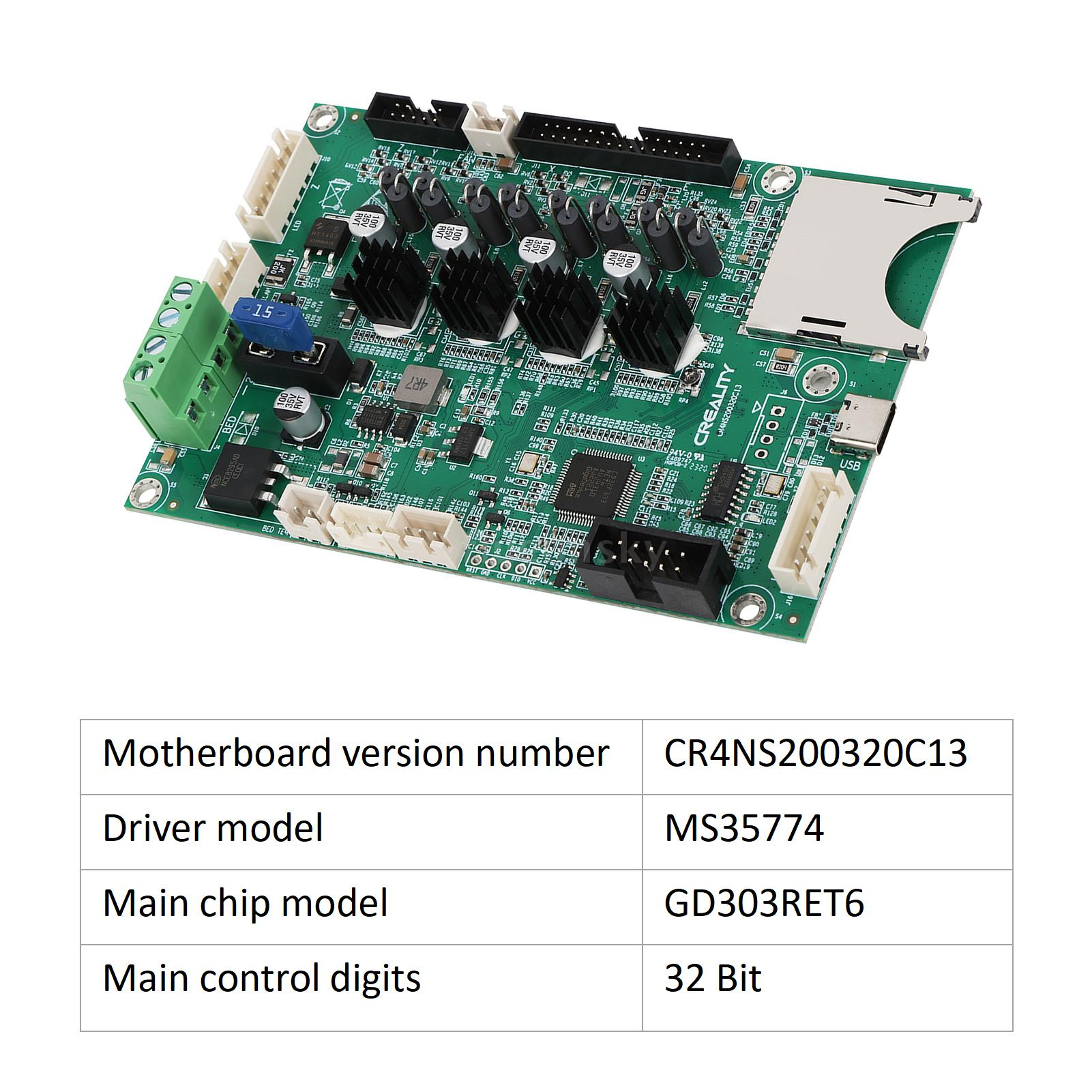 Adecuado para: Ender-3V3 SE Número de versión de la placa base: CR4NS200320C13 Modelo del controlador: MS35774 Modelo del chip principal: GD303RET6 Dígitos de control principal: 32 bits Tamaño del paquete: 150×115×45mm / 5.9×4.5×1.7in Peso del paquete: 134g / 4.7oz